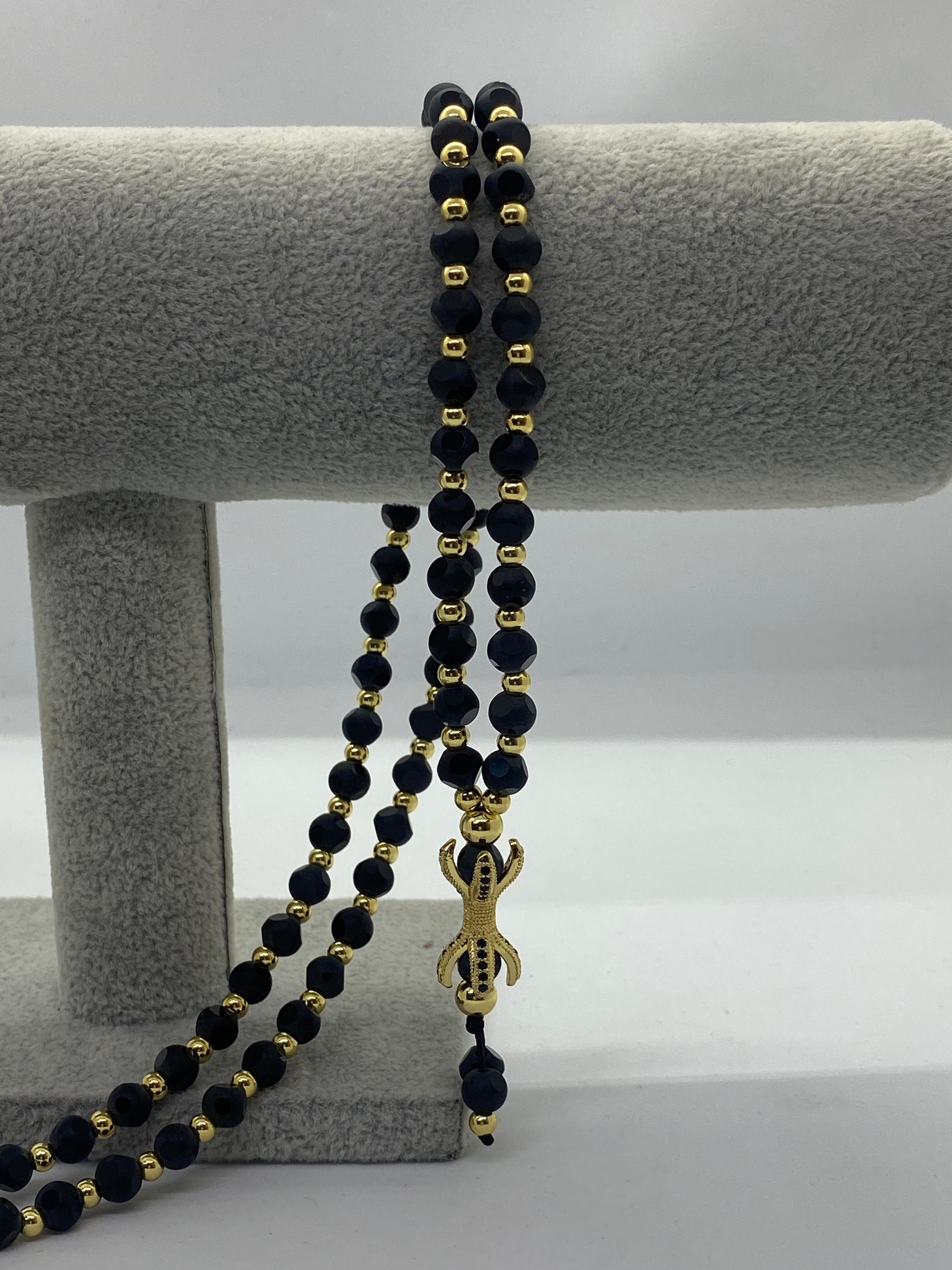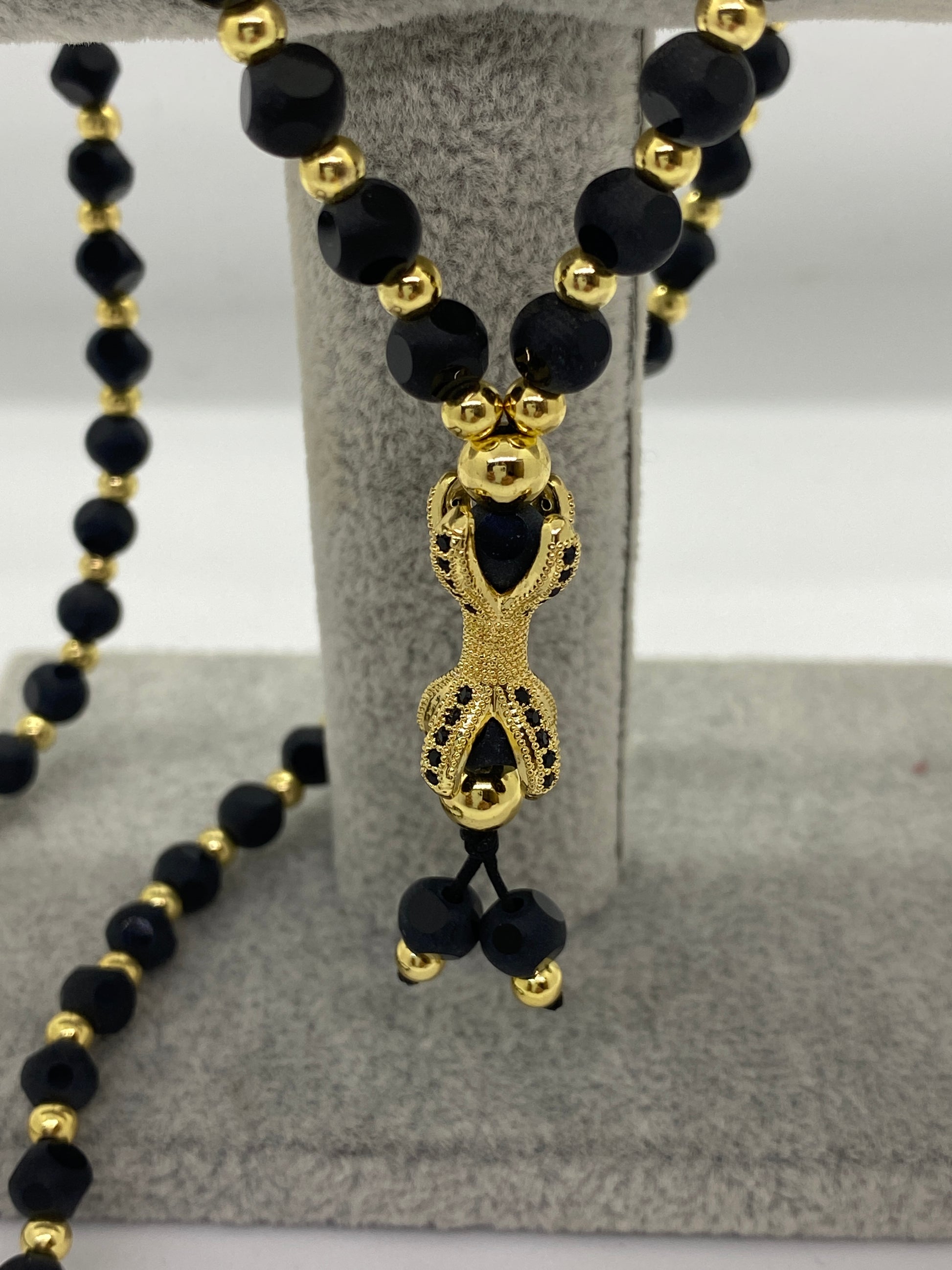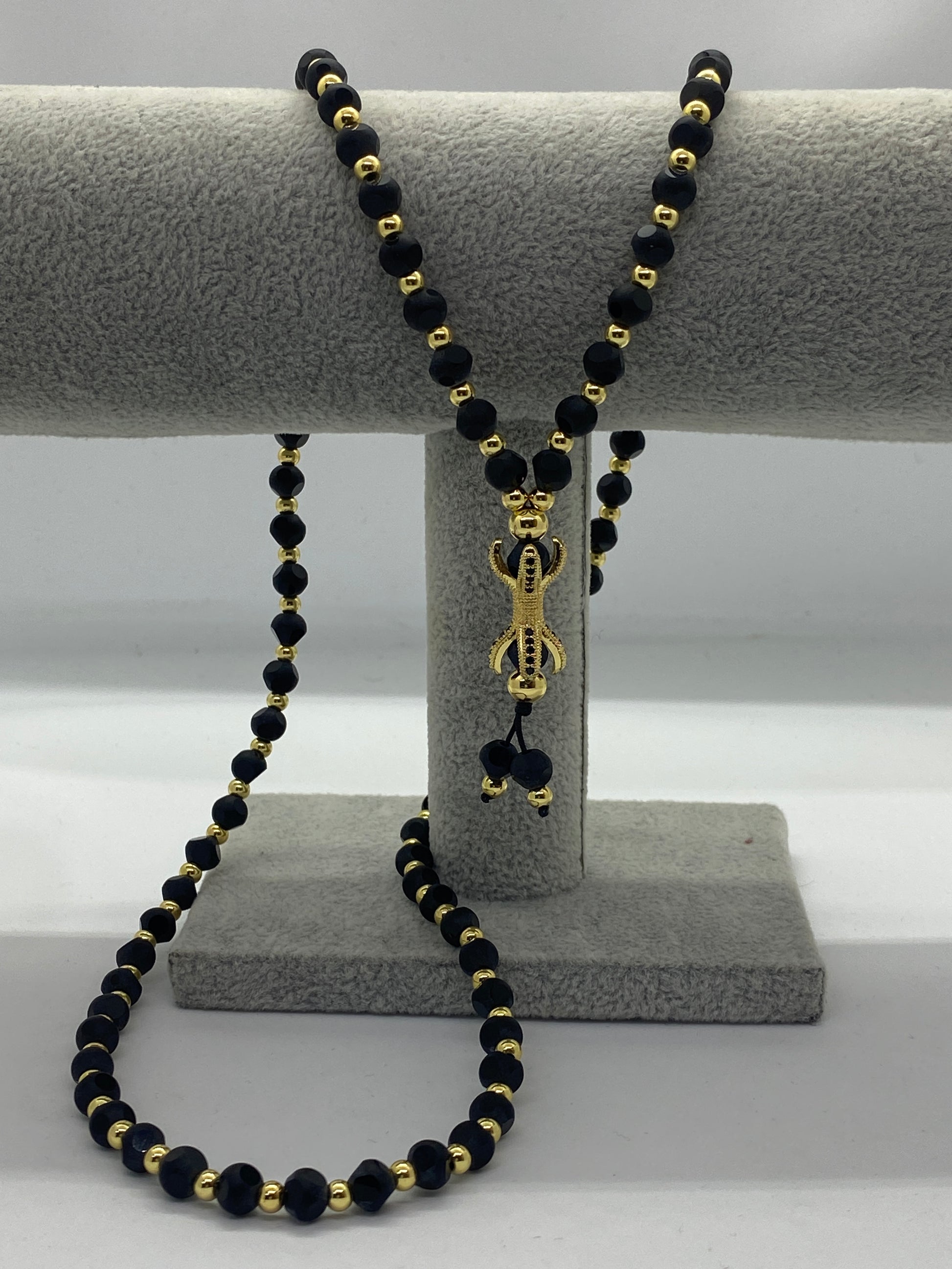 Lanțul 'Black Gold Claw' reprezintă o declarație de rafinament, cu o construcție robustă din bile de piatră și o gheară în culori contrastante de aur și negru.