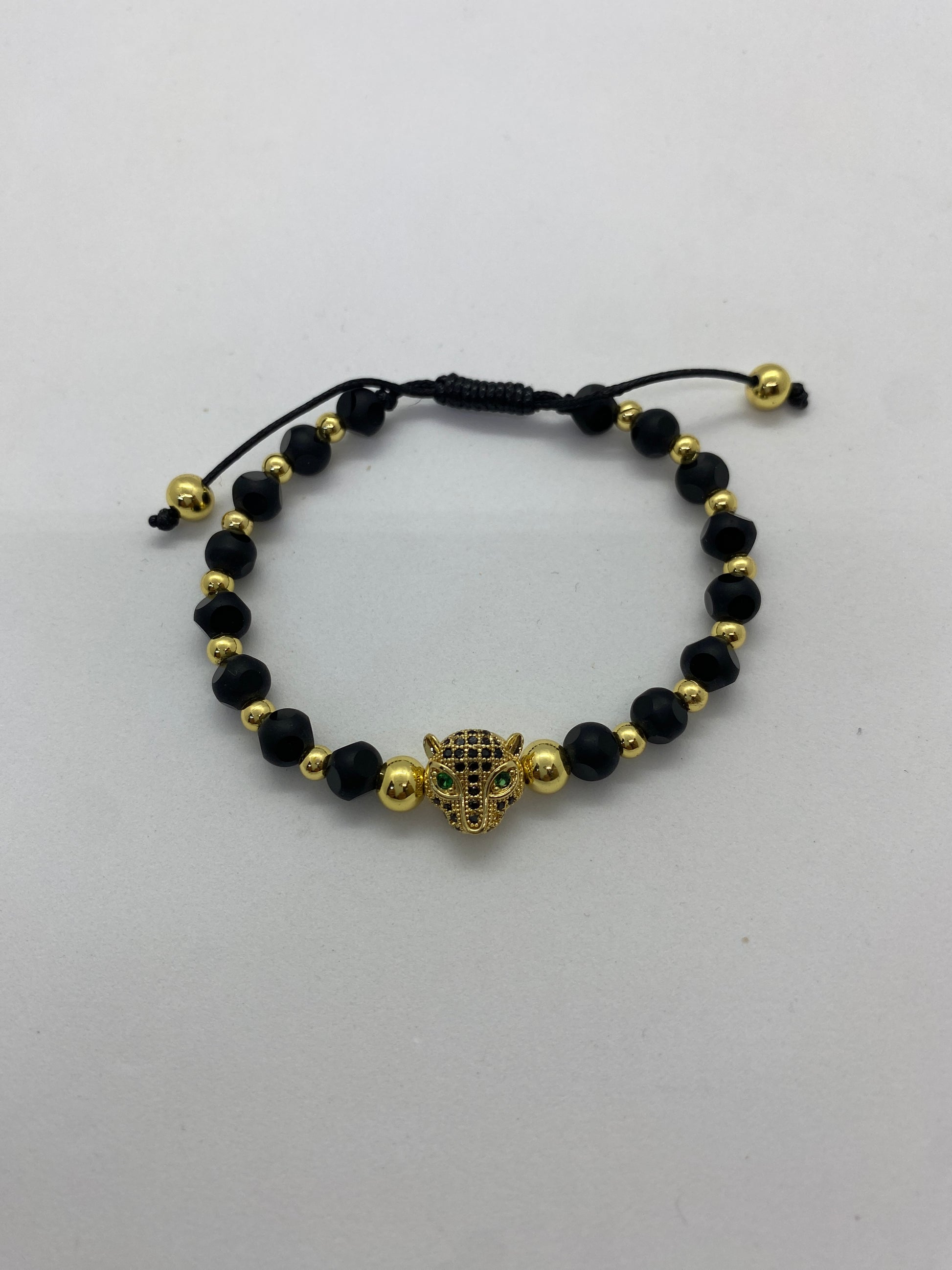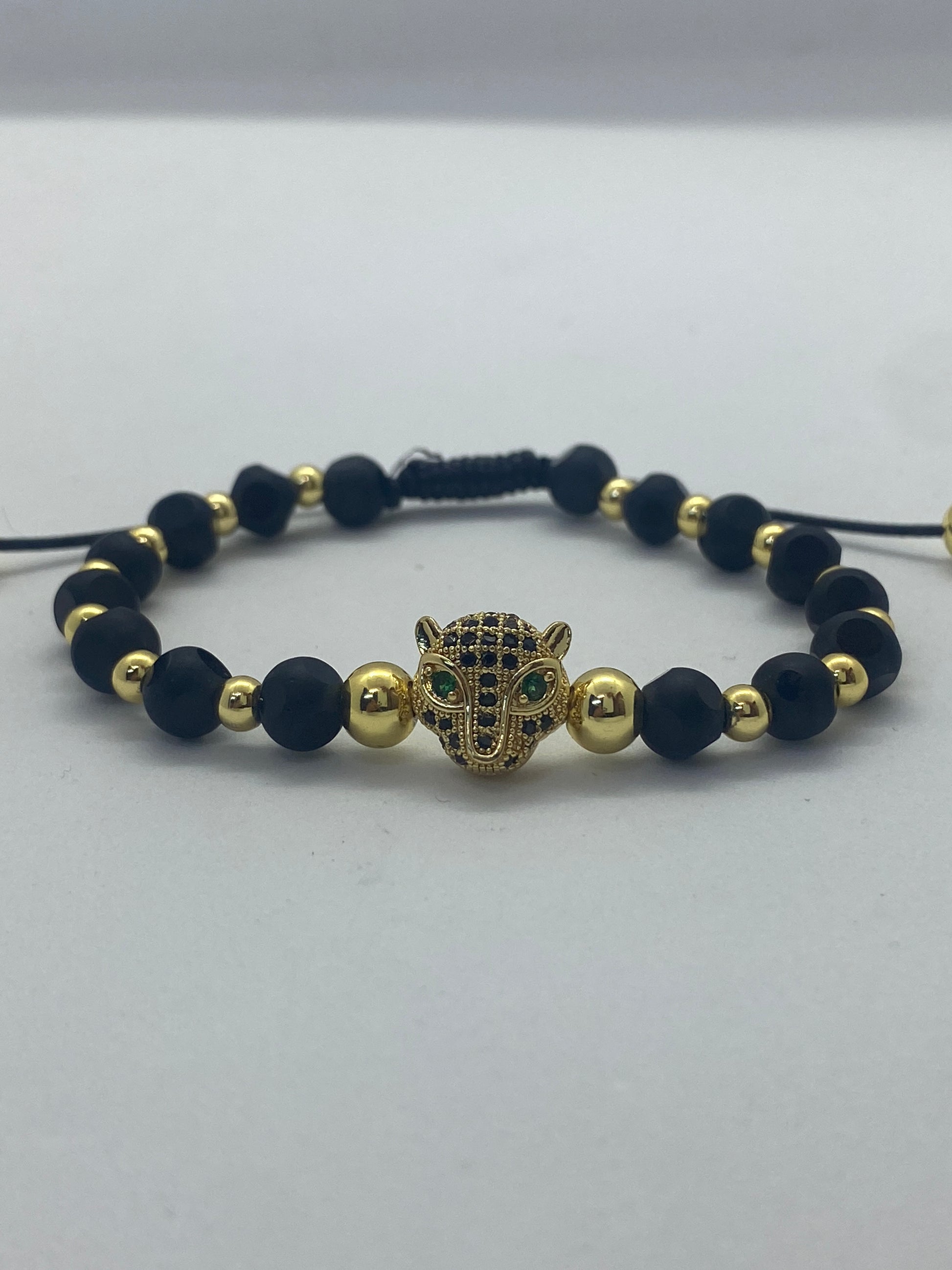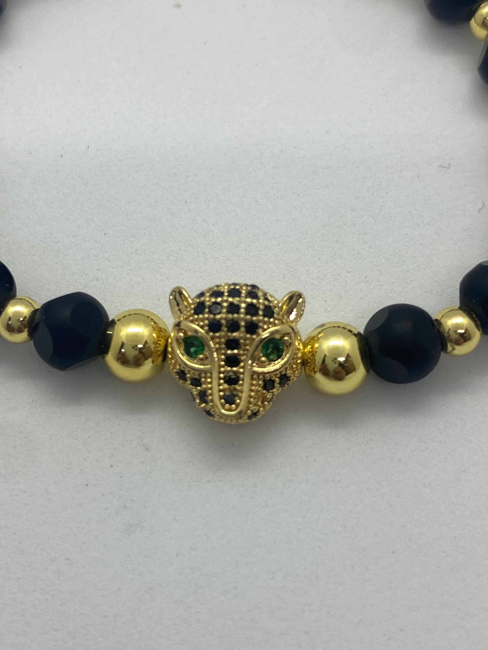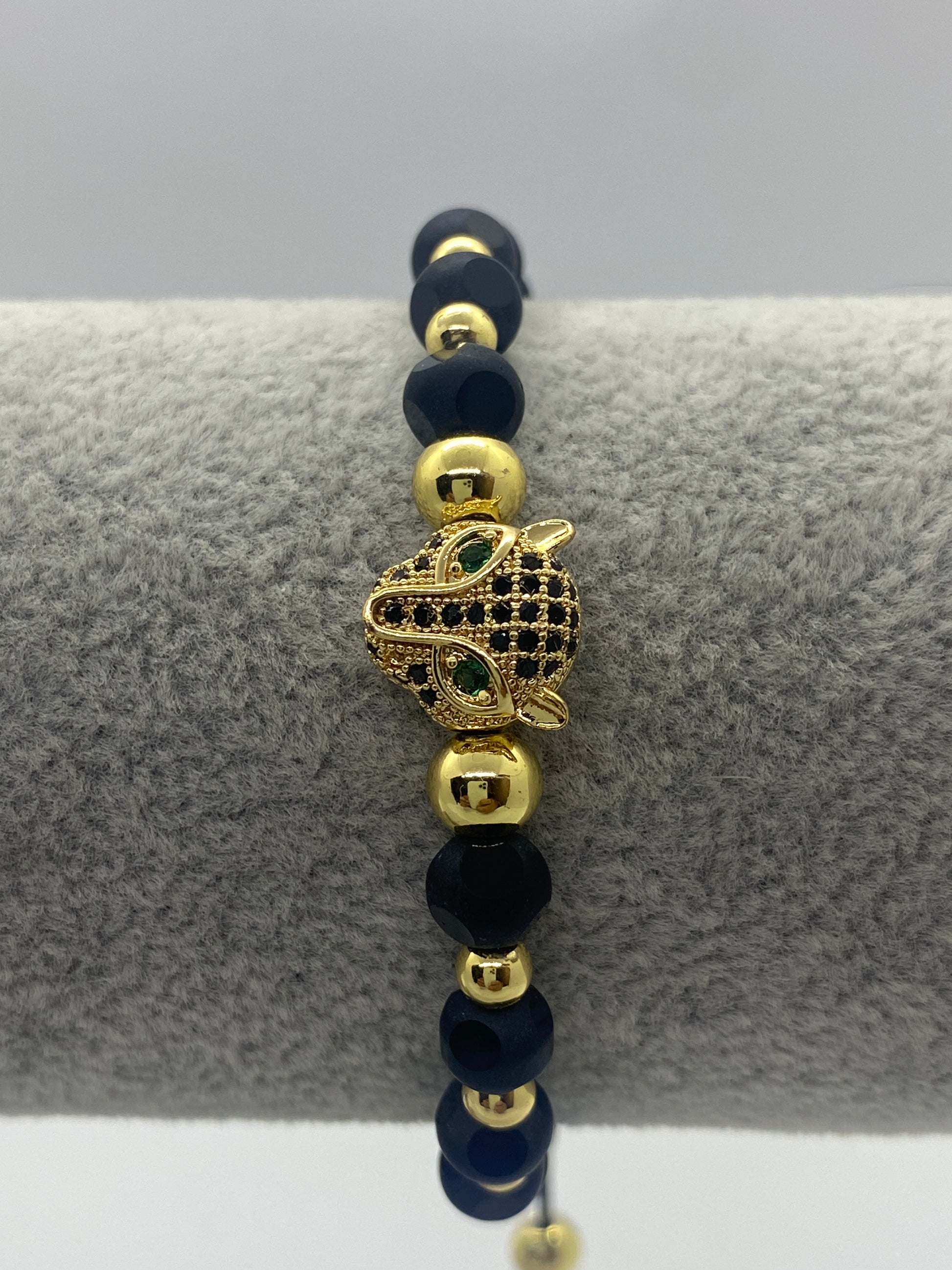 Cu un mix de piatră mată neagră și oțel inoxidabil aurit, această brățară emană un contrast subtil între forța naturală și eleganța contemporană. Un accesoriu perfect pentru a sublinia personalitatea puternică a purtătorului într-un mod discret și atrăgător.