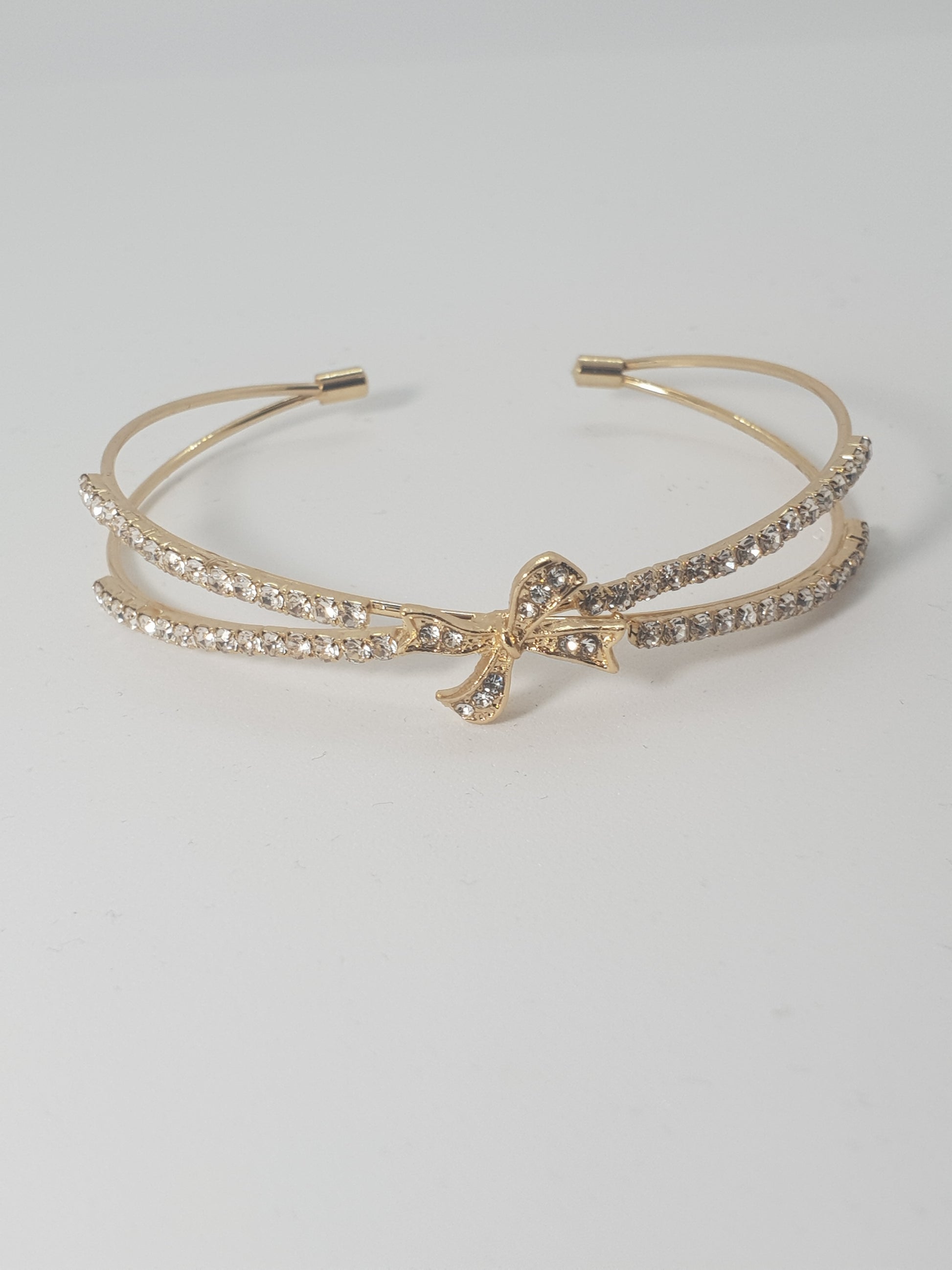 Bratara de dama formata din doua cercuri trunchiate din inox inoxidabil de culoare aurie este un accesoriu elegant si deosebit. Cele doua cercuri sunt accesorizate cu cristale de zirconium pe o suprafata de 60%, care adauga o stralucire subtila si eleganta bratarii.