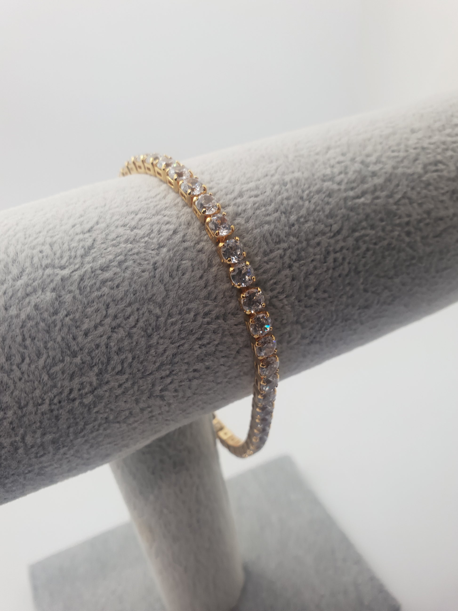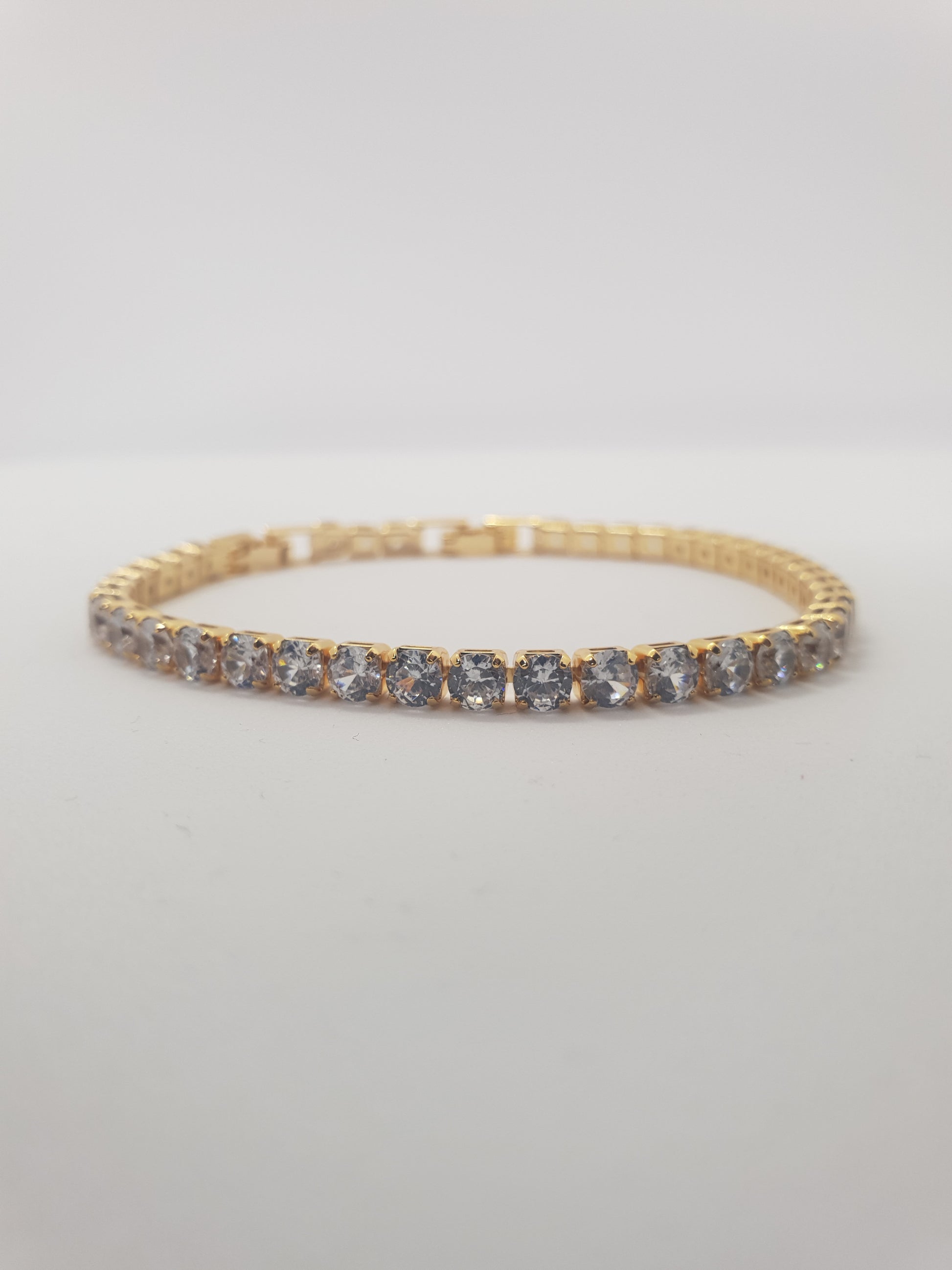 Bratara Tennis Clasic Gold este un accesoriu elegant si rafinat pentru femei, realizata din otel inoxidabil de inalta calitate, cu pietre stralucitoare din zirconiu asezate in linie. Cu un design simplu si elegant, aceasta bratara este prevazuta cu o inchizatoare reglabila, care permite ajustarea dimensiunii cu pana la 3 cm