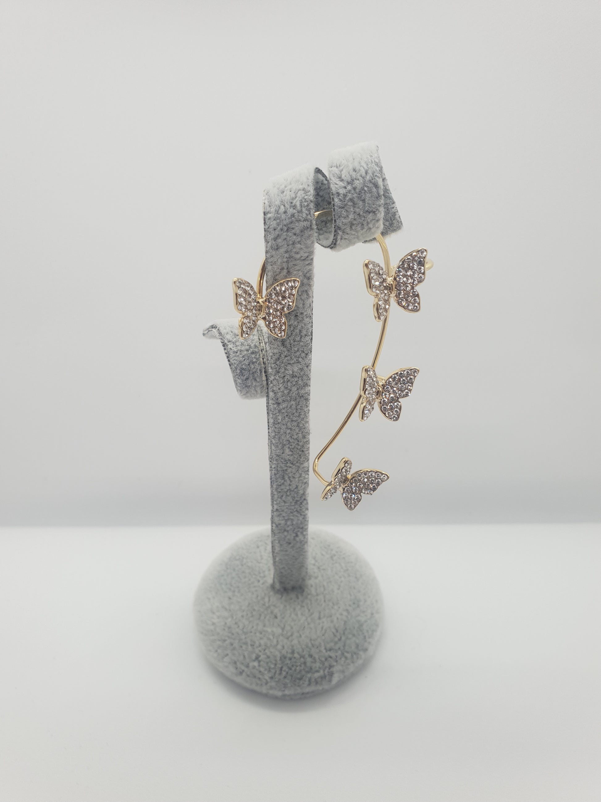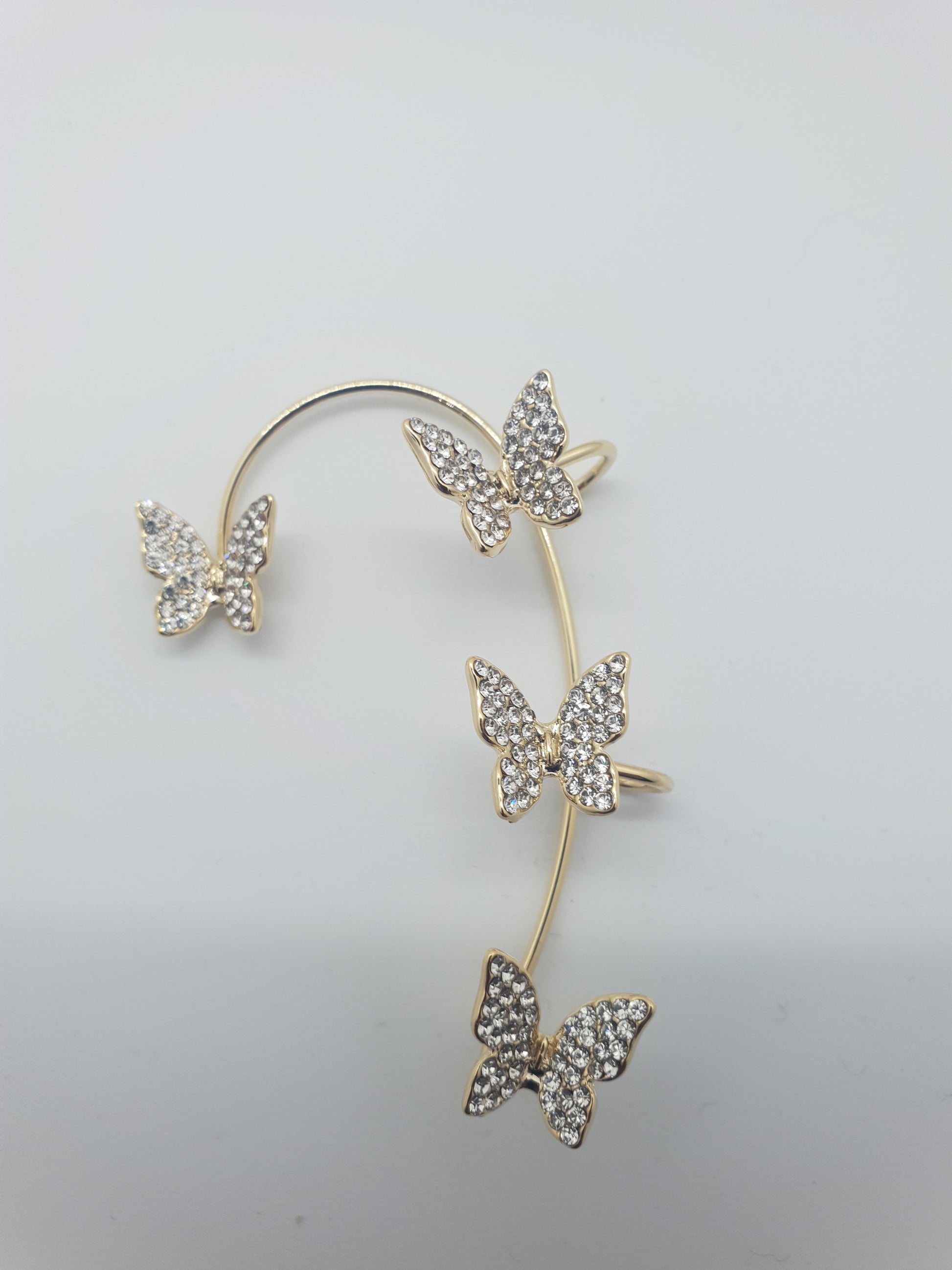 Acest cercel de damă pentru o singură ureche este fabricat din oțel inoxidabil și are o culoare aurie strălucitoare. Cercul este împodobit cu patru fluturași din cristale de zirconiu, care adaugă un element de strălucire și frumusețe la design