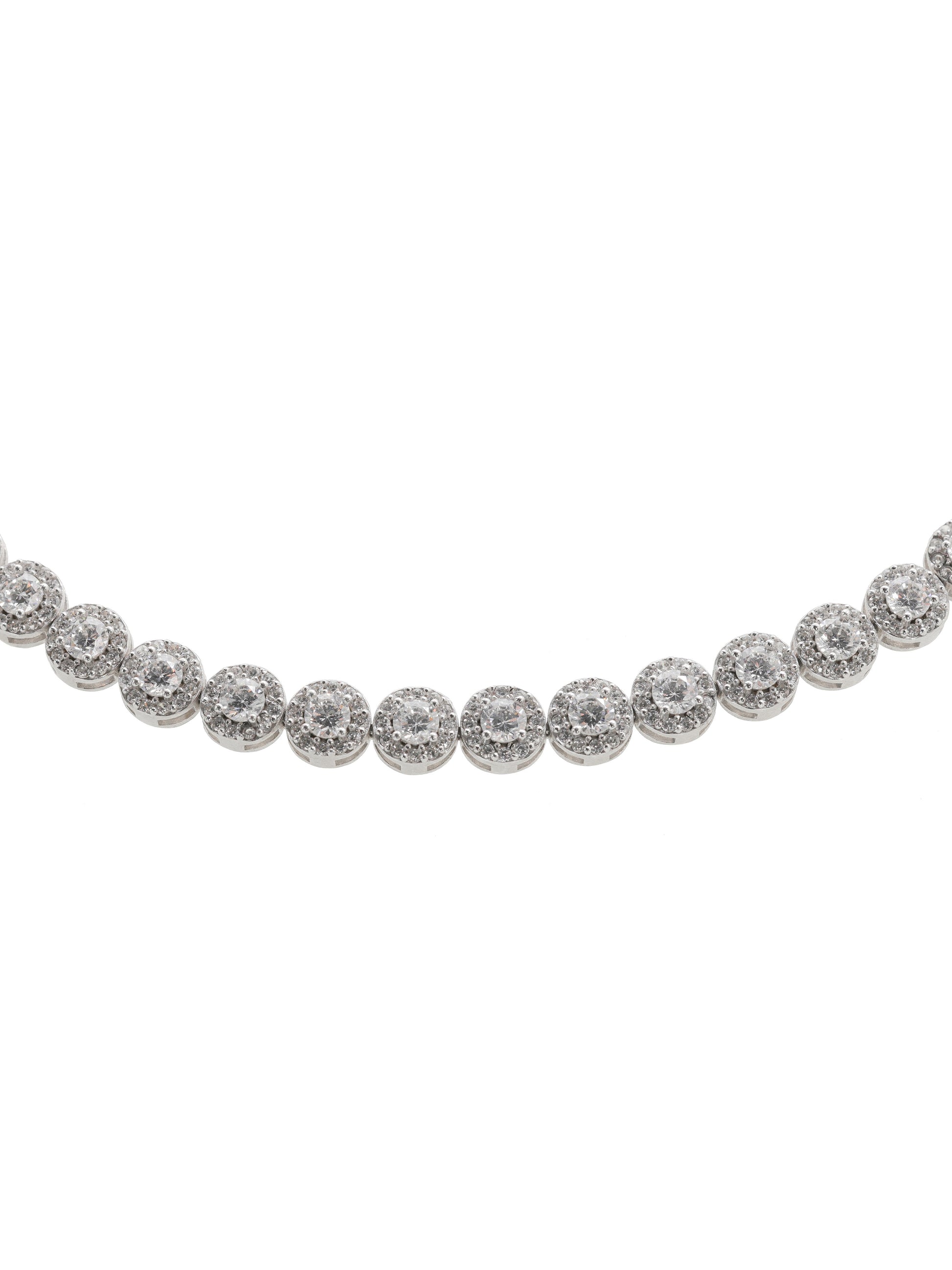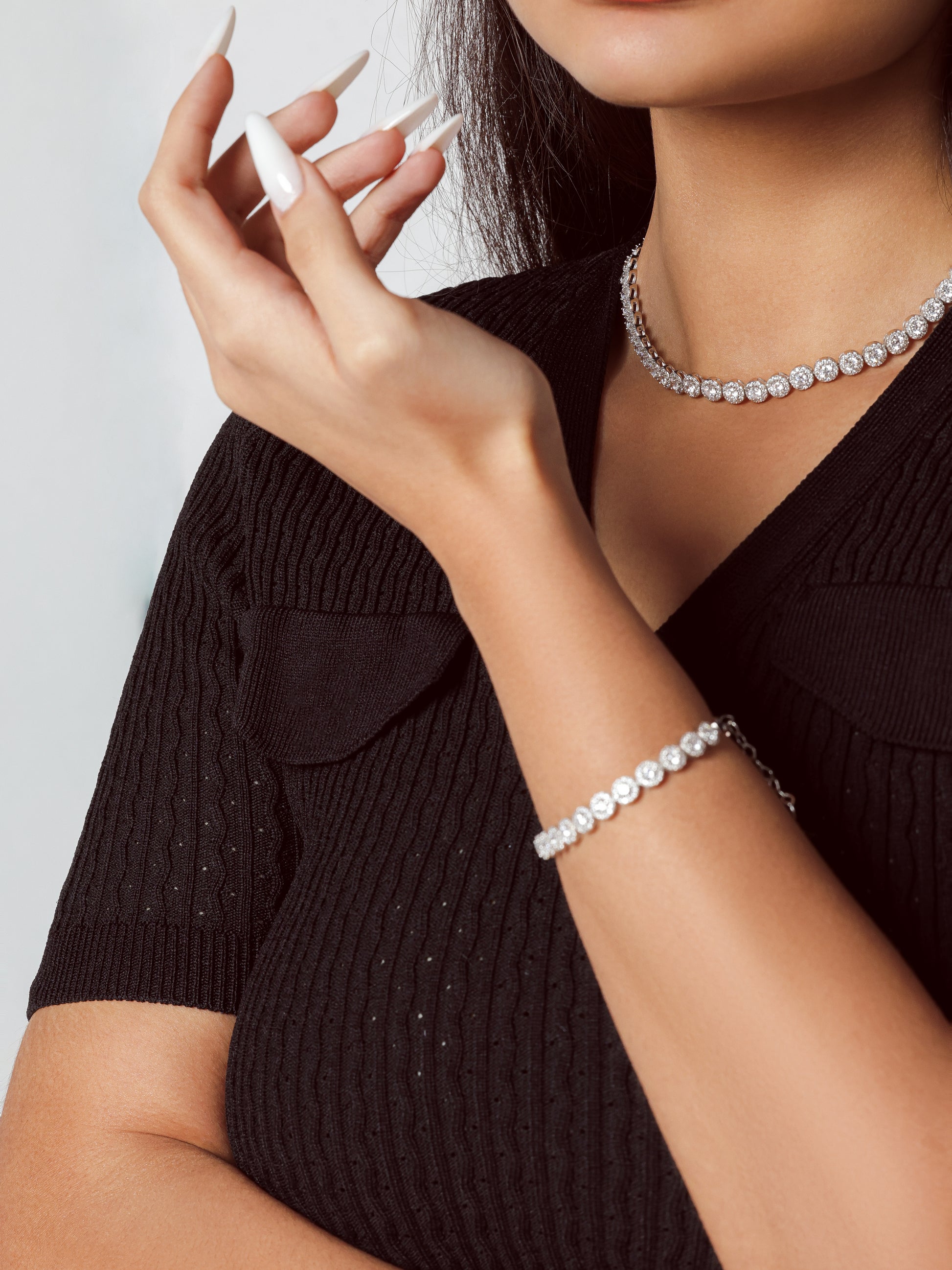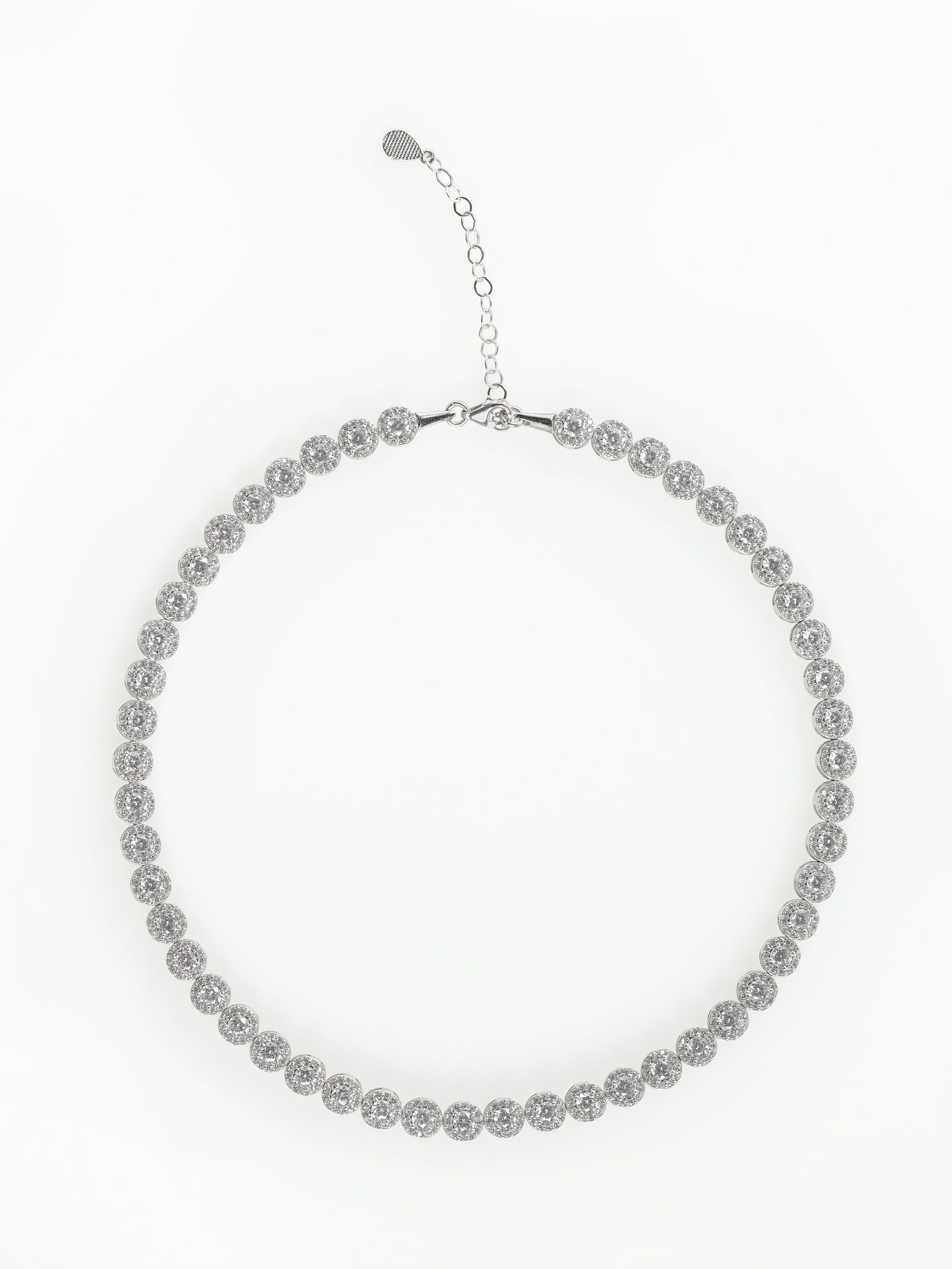Fiecare detaliu al acestui colier emană rafinament și eleganță. Realizat din argint 925 și decorat cu pietre de zirconiu strălucitoare, acest design inspirat de stilul iconic Angelic aduce un plus de grație fiecărei apariții. Fiecare piatră centrală este înconjurată de un halou delicat de zirconii mici, creând un efect spectaculos de lumină și profunzime.