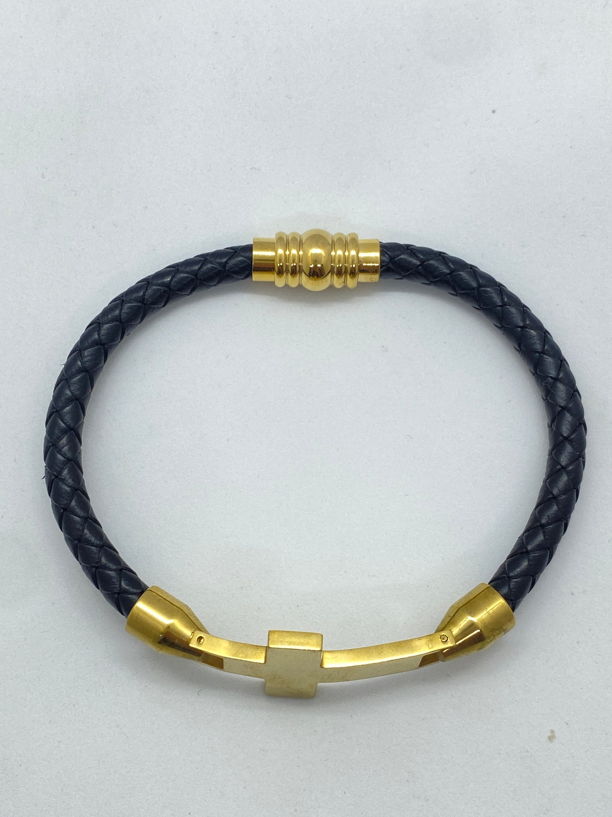 Adaugă un plus de rafinament ținutei tale cu această brățară din piele înșirată, prevăzută cu o închidere magnetică și o cataramă elegantă în formă de cruce aurie. Un element deosebit de expresiv, care îmbină subtil moda cu simbolismul.