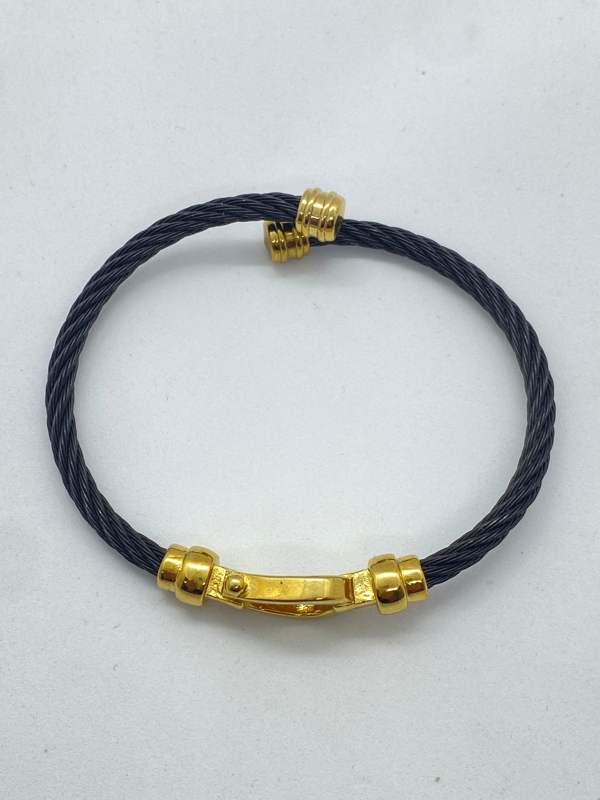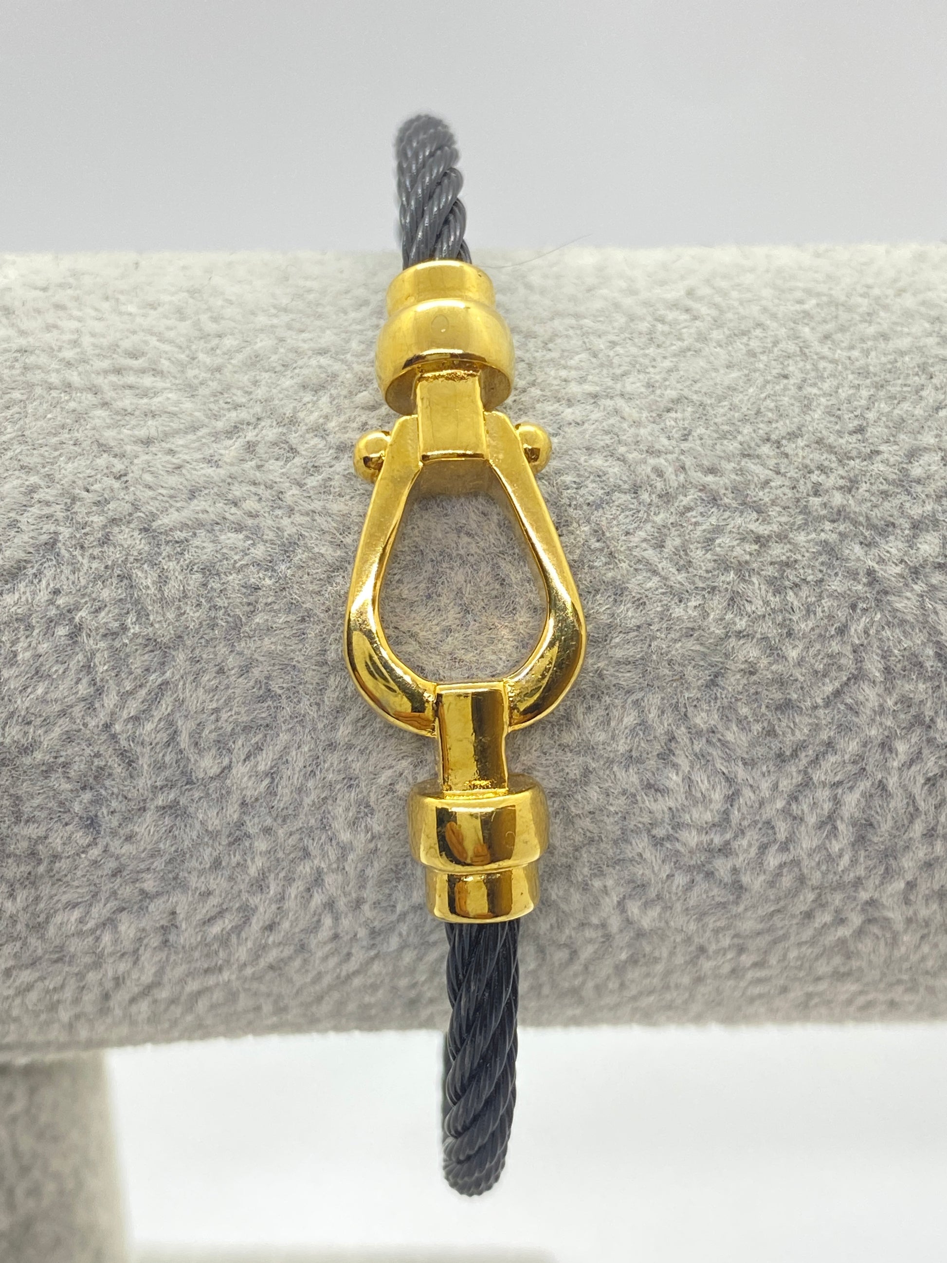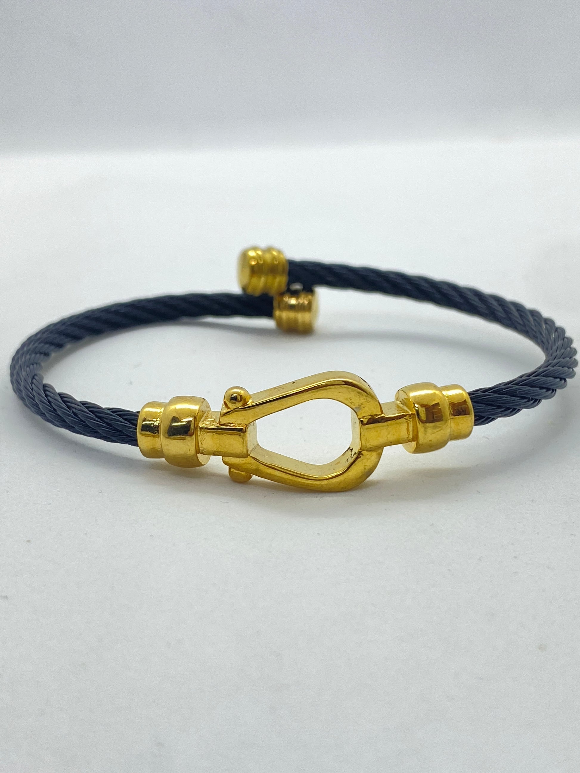 Descoperă brățara perfectă pentru bărbați, confecționată din sârmă de oțel inoxidabil și îmbogățită cu o cataramă centrală în formă de potcoavă aurie. O expresie a stilului modern și a forței, această bijuterie subliniază originalitatea și determinarea."