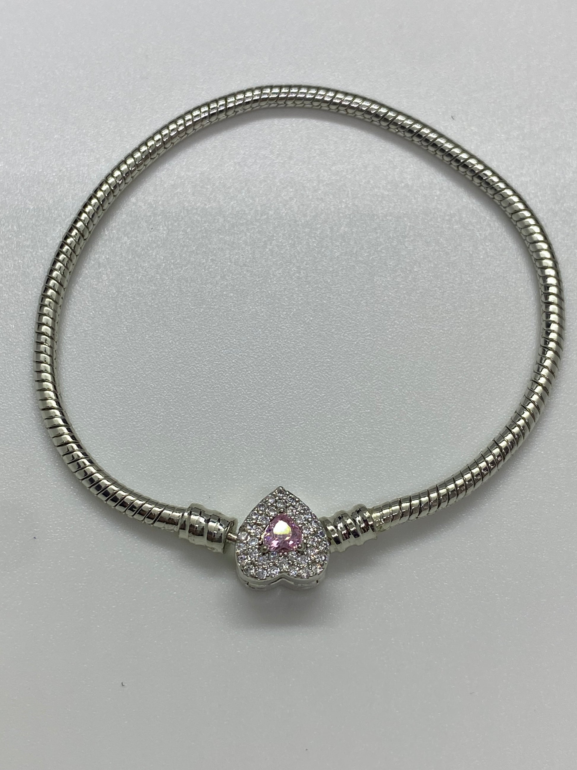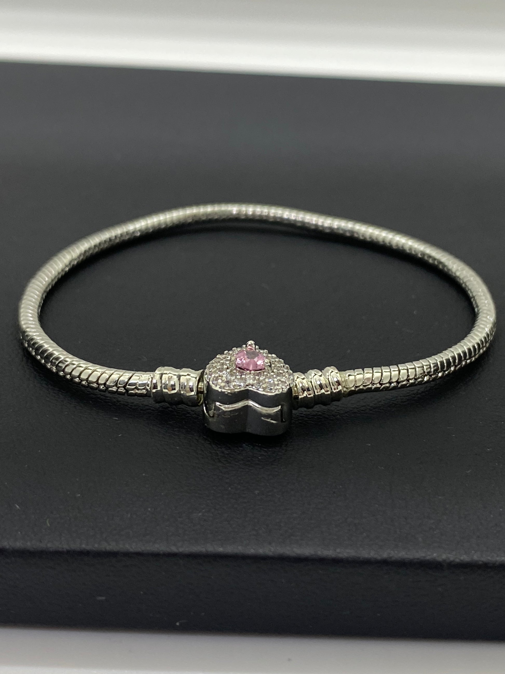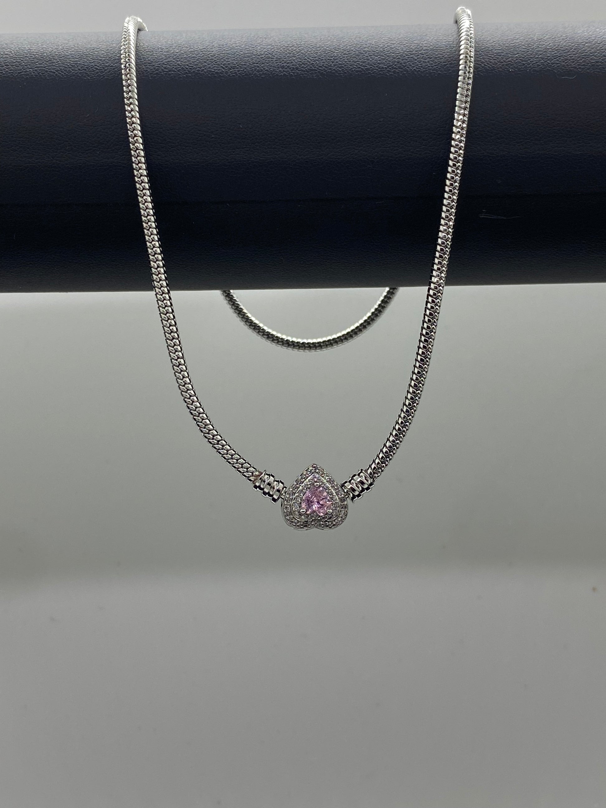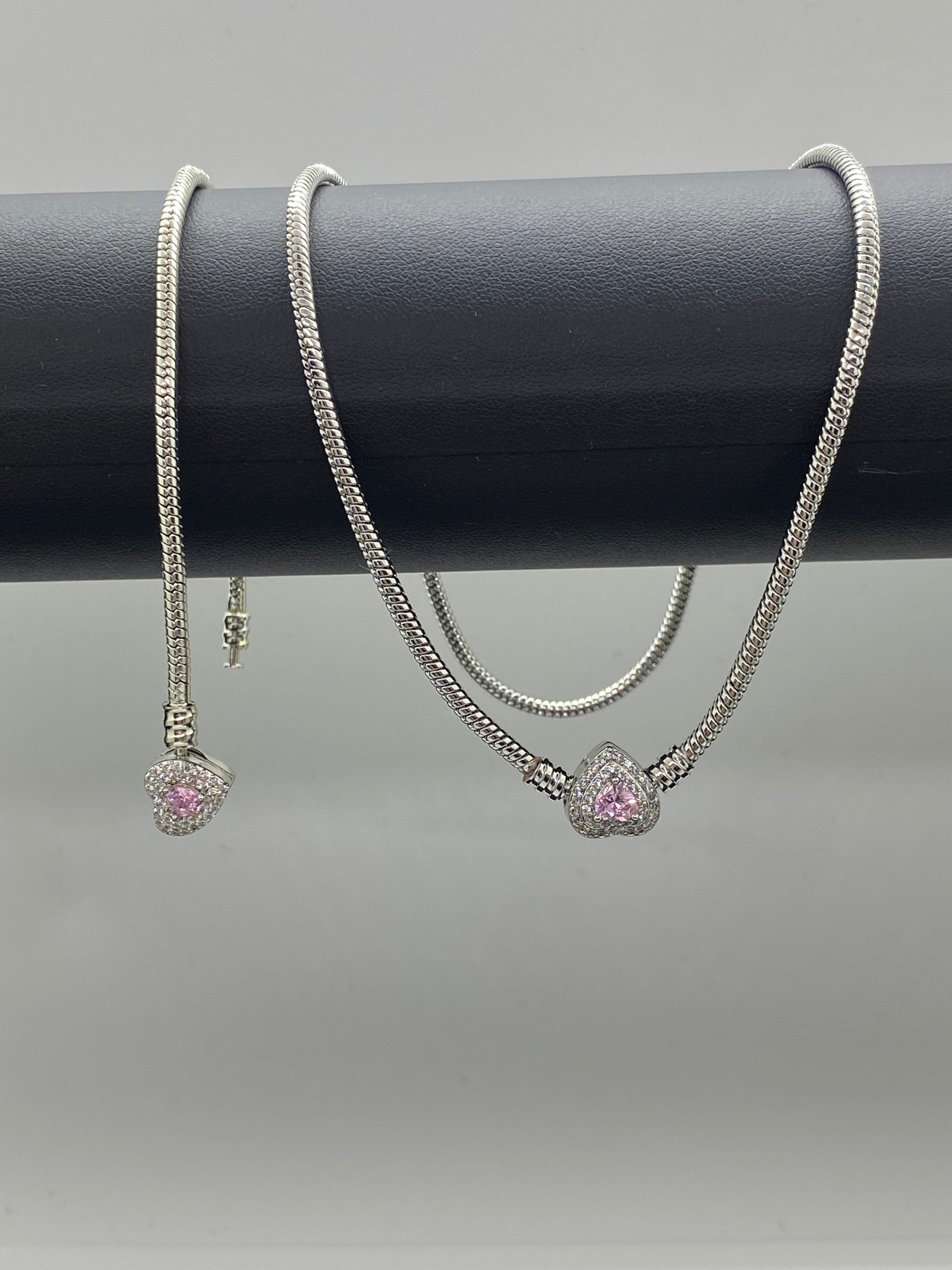 Set bijuterii din oțel inoxidabil: Colier și brățară cu charm inimioară Bucură-te de un design premium cu acest set complet de bijuterii pentru femei. Setul include colierul cu profil rotund și brățara perfect asortată, ambele remarcându-se prin structura lor modernă, de tip Pandora. Fiecare piesă este prevăzută cu un element central în formă de inimă, încrustat cu o piatră de zirconiu roz și un halou din cristale albe sclipitoare.